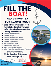 Help us donate a BOATLOAD of food! Drop of non-perishable food items to be donated the week before Thanksgiving to McHenry County Food Pantry's. Drop off during winter service and storage now through November 17th.